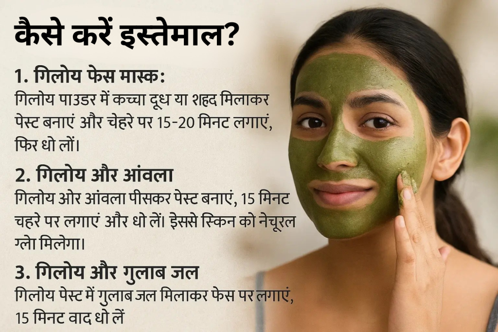 गिलोय पाउडर में कच्चा दूध या शहद मिलाकर पेस्ट बनाएं और चेहरे पर 15-20 मिनट लगाएं, फिर धो लें। हफ्ते में 1-2 बार इस्तेमाल करें।: