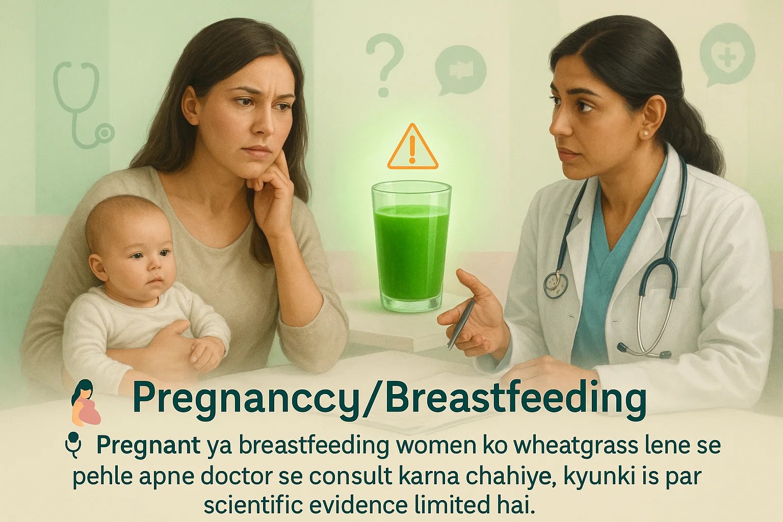 Pregnant ya breastfeeding women ko wheatgrass lene se pehle apne doctor se consult karna chahiye, kyunki is par scientific evidence limited hai